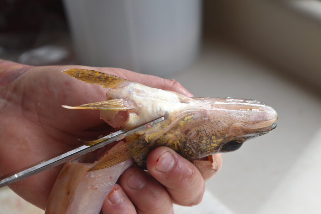 Removing the walleye cheeks is quite simple. Picture the cheek socket as a “bowl,” and insert the tip of your knife just at the edge of the cheek bone, into the meat just behind the eyeball. Slowly work your knife tip up and down, following the edge of the cheek socket in a circle. Once the circle is complete the meat should pop out and the skin should pull right off.