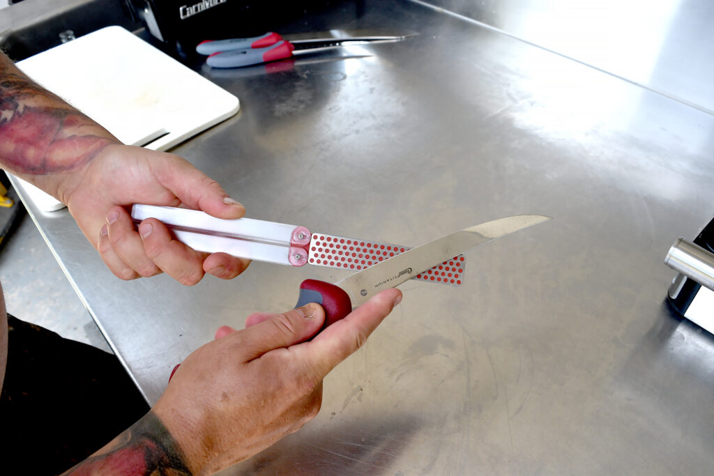 I’m old school when it comes to breaking down meat for stew or cubing it for the grinder. I love a scimitar-style butcher knife. Clauss’ butcher-style knife is an awesome, durable knife with an oversized backbone, making it very sturdy. The 10-inch blade makes cutting large moose steaks a breeze.