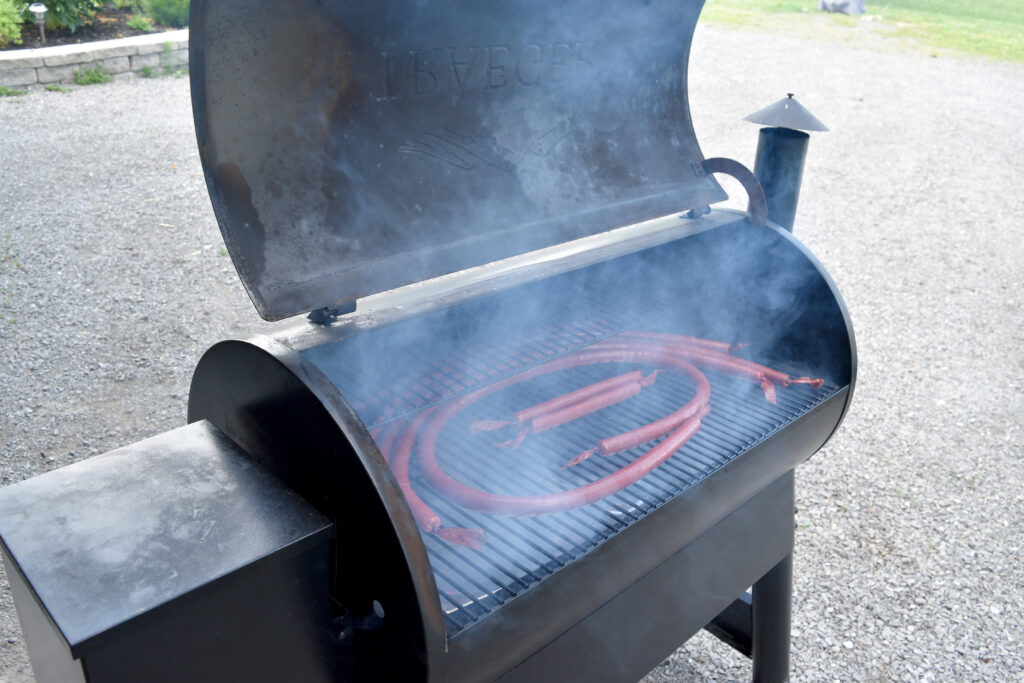 I now use a Traeger Pro 34 electric pellet smoker. With more than 5,700 square centimetres of grilling space, this smoker allows me to do large batches of pepperettes or sausage on a nice, low, steady temperature. The built-in meat thermometer is crucial when testing your product’s internal temperature. When you’re done smoking, crank up the heat and toss on a nice rack of venison for a great sear and unbeatable flavour.