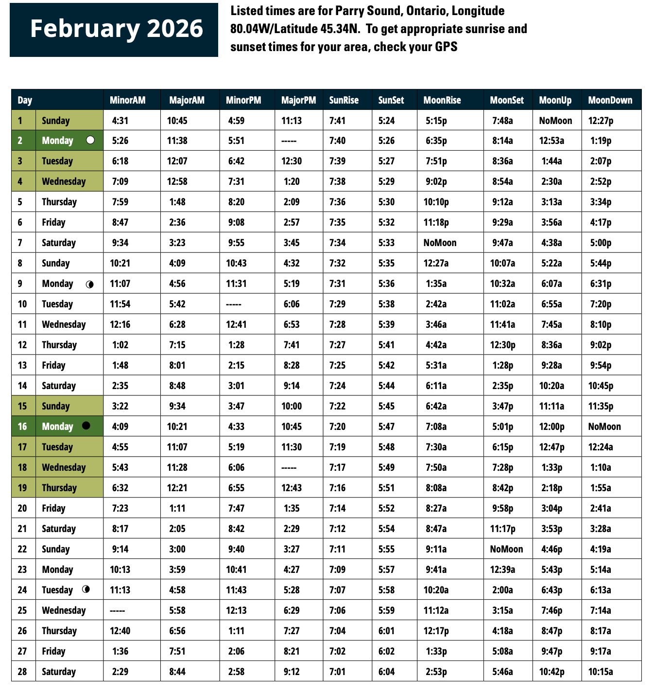 Dark green: Days when fish and game are most active in February 2026